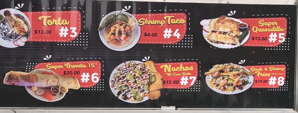 Camarones,, lechuga, tomate, cebolla, mayonesa, guacamole, queso derretido y crema. /Shrimp, lettuce, tomato, onion, mayonnaise, guacamole, melted cheese and sour cream.